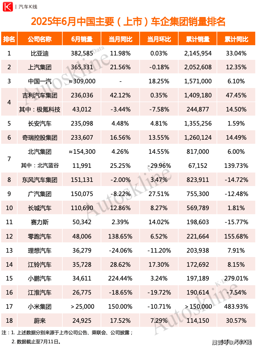 截至7月14日,《汽車K線》統(tǒng)計(jì),18家中國主要上市車企/集團(tuán)完成公布6月銷量業(yè)績,情況喜大普奔。