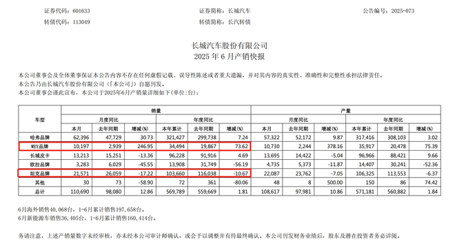 從市場表現來看,長城汽車在今年上半年呈現微增長態勢,今年1至6月累計銷量達56.97萬輛,同比增長1.84%。其中,哈弗品牌、魏牌均實現正增長,哈弗品牌上半年銷量32.14萬輛,魏牌得益于新款的上市,上半年銷量同比增漲73.62%。坦克品牌上半年銷量達10.36萬輛,面對上半年新能源越野市場競爭壓力,同比下滑了10.67%。