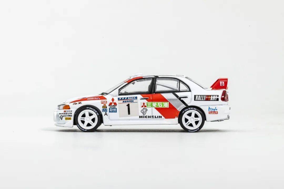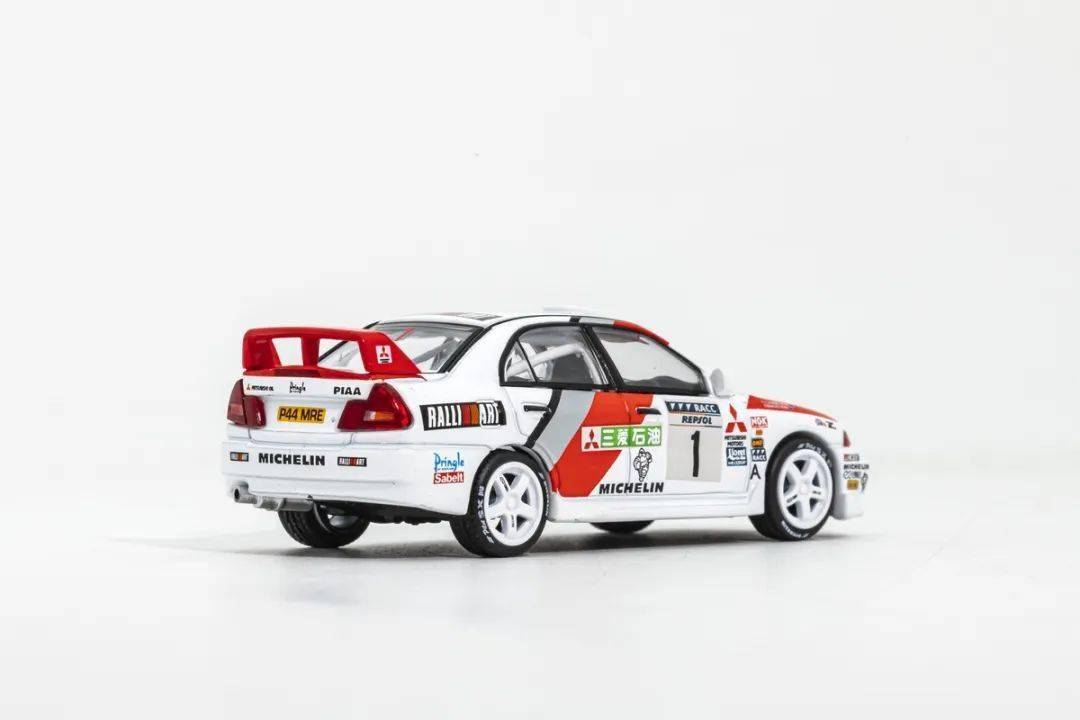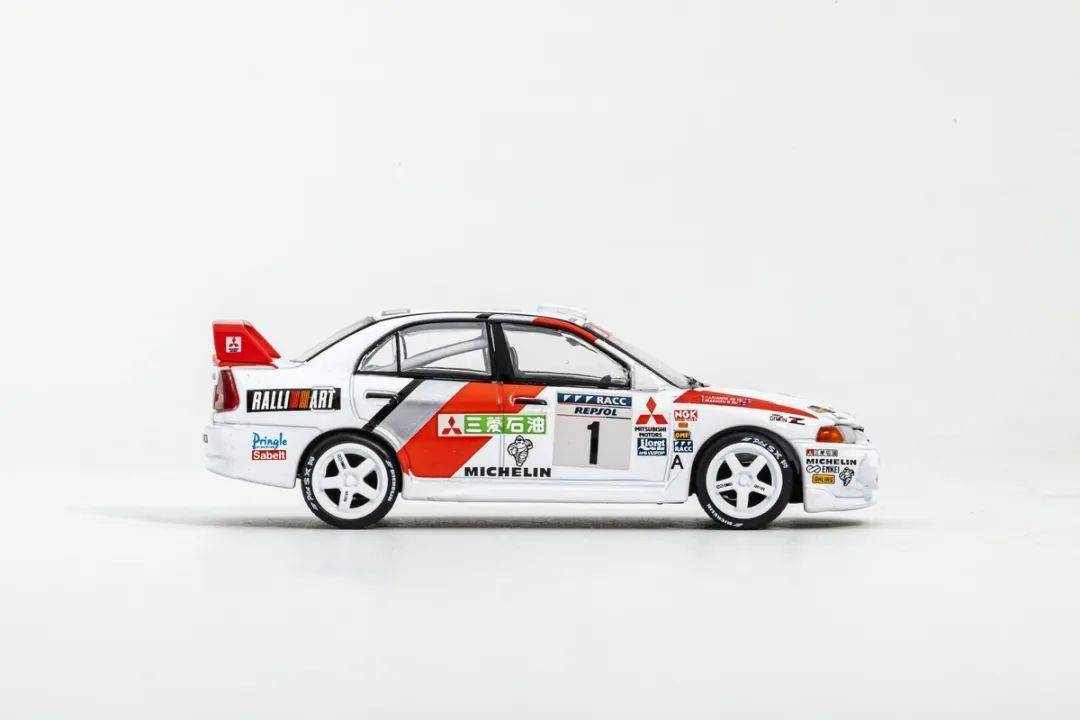 模型的形準只能說基本沒問題,EVO IV短小精悍的外形,模型也算還原到位;這次試玩的EVO IV為拉力賽車版本,底漆是白色漆,漆面質感還不錯,縫隙啥的也在正常范圍內,賽車拉花應該都是移印的,整體效果還行;模型側轉向燈也是浮雕+移印的,車門把手為浮雕刻畫,模型的側包圍為浮雕刻畫,前唇的側風刀貌似非鏤空;模型的車窗有黑色邊框,B柱為浮雕+涂黑刻畫;車外后視鏡改成拉力賽車款,很小巧。