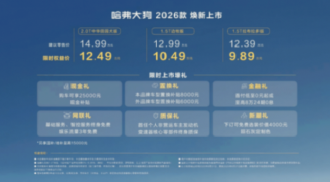 2025年7月17日,2026款哈弗大狗正式上市,新車?yán)^續(xù)推出3個(gè)配置版本,指導(dǎo)價(jià)區(qū)間為12.39-14.99萬元,同時(shí)官方推出限時(shí)購車權(quán)益價(jià)區(qū)間為9.89-12.49萬元(2.5萬元現(xiàn)金補(bǔ)貼)。作為年度改款,新車主要在外觀細(xì)節(jié)和配置上做了升級(jí),新增快拆前臉設(shè)計(jì),方便用戶自行改裝。據(jù)悉,哈弗大狗上市至今累計(jì)銷量已突破60萬臺(tái),截至2025年5月,不僅連續(xù)12個(gè)月銷量破萬,還拿下了42個(gè)月的“方盒子”車型銷量冠軍。