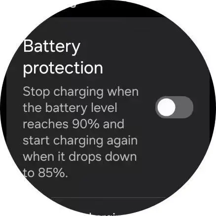 而在 Galaxy Watch8 系列中,三星引入了“電池保護”選項,其描述為:“在電量達到 90% 后停止充電,在電量低于 85% 后重新開始充電”。