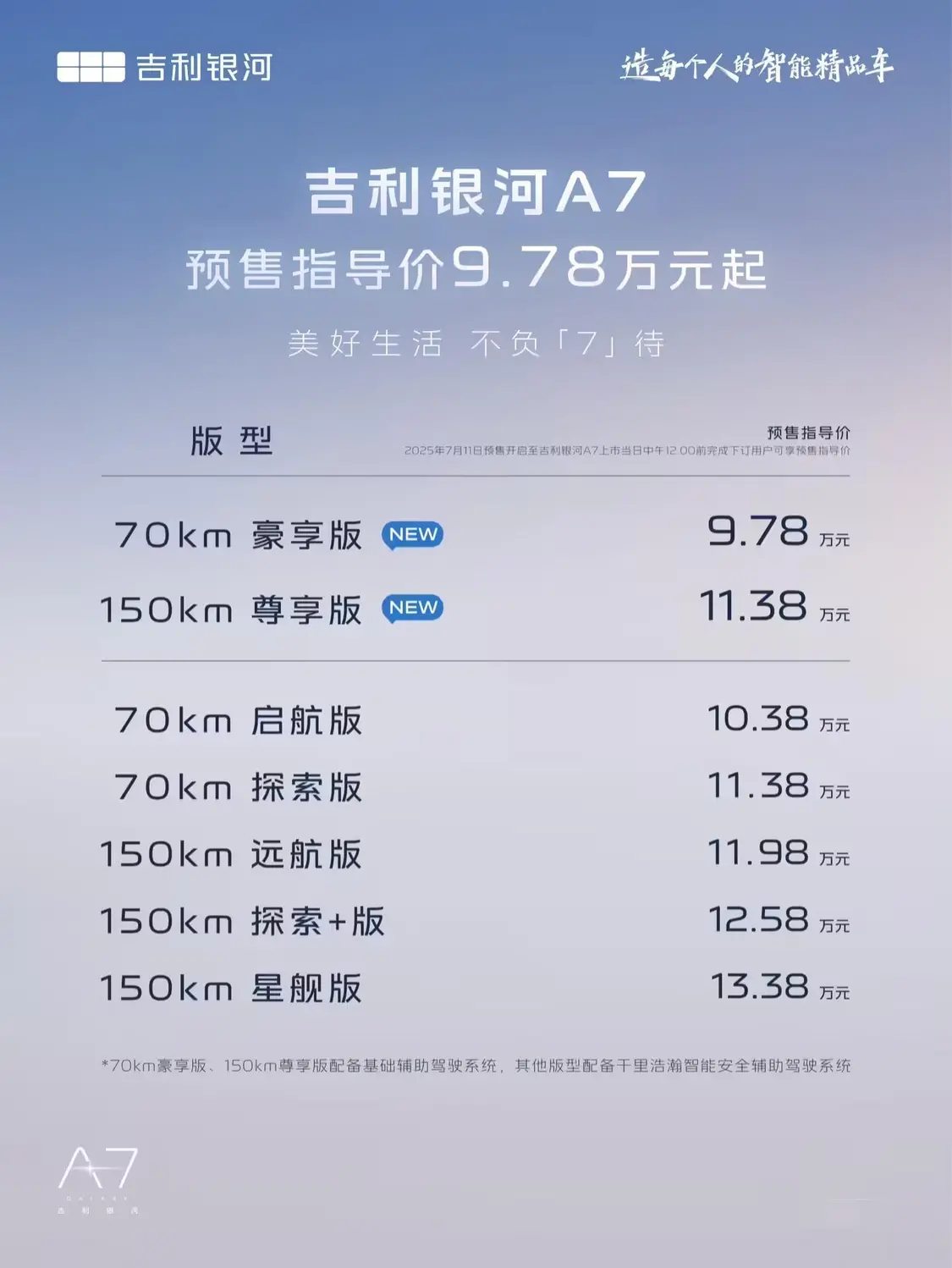 7 月 18 日消息,吉利銀河新能源官微今天下午宣布,剛剛啟動預售的全新中型轎車 —— 銀河 A7 將加推基礎輔助駕駛版型。官方放出的最新配置表顯示,此次新增的配置為 70km 豪享版和 150km 尊享版,預售指導價分別為 9.78 萬元、11.38 萬元。