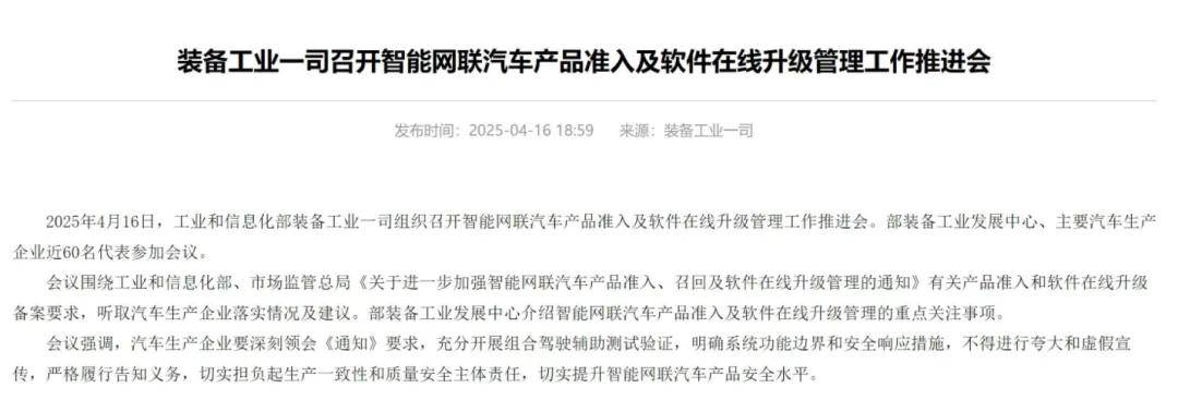 然而,當行業還沉浸在“全民智駕”的狂歡時,上半年多次智駕事故風波,最終還是引出了官方的監管動作。4月16日,工信部召開智能網聯汽車產品準入及軟件在線升級管理工作推進會。同時,還流傳出了一份會議紀要。這次舉動被認為官方開始釋放對智駕監管收緊的信號。