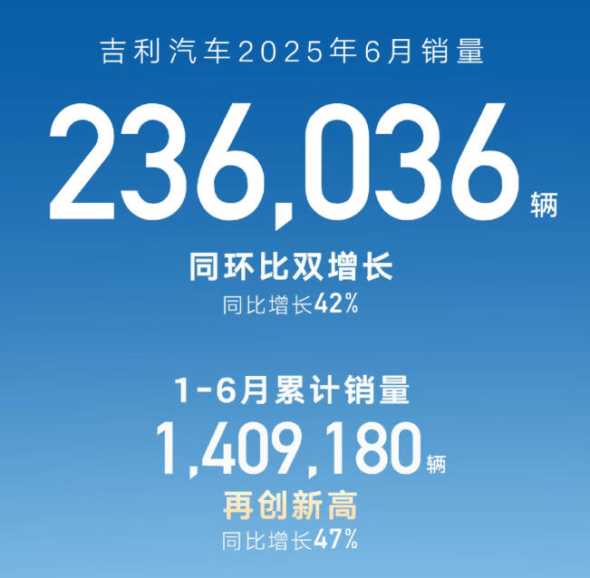 2025年1-6月,吉利汽車累銷超140萬輛,同比增長47%。其中,新能源累銷超72.5萬輛,同比增長高達126%,占比總銷量51.5%。