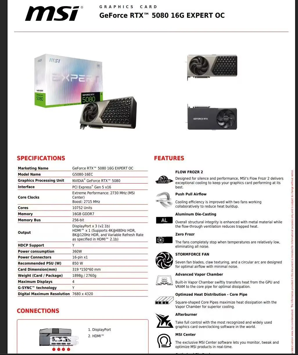 規格方面,RTX 5080 Expert 重約 1.9 公斤,尺寸約 319 ×150 ×60mm;OC 加速頻率可達 2715 MHz,功耗為 360W,需搭配 850W 及以上電源使用;提供三個 DP 2.1b 和一個 HDMI 2.1b 接口。