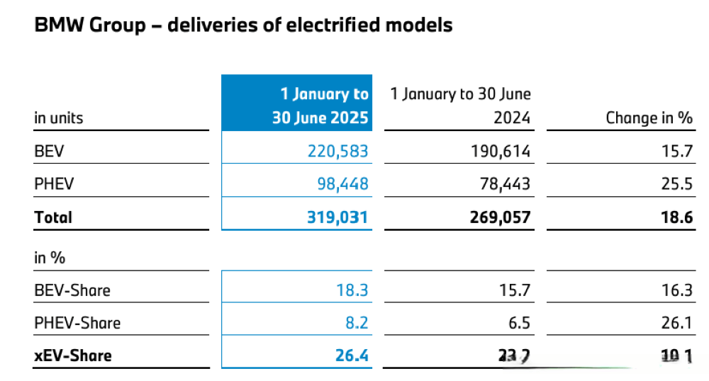 寶馬集團(tuán)2025年上半年全球汽車(chē)銷(xiāo)量為120.74萬(wàn)輛同比下降0.5%。不過(guò)寶馬在新能源車(chē)型銷(xiāo)量上表現(xiàn)亮眼,達(dá)到31.90萬(wàn)輛,同比增長(zhǎng)18.6%,其中純電動(dòng)車(chē)型銷(xiāo)量達(dá)到22.06萬(wàn)輛,同比增長(zhǎng)15.7%。