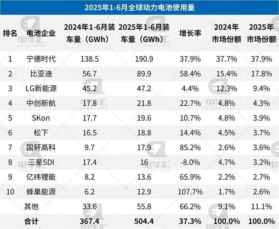 1-6月全球動力電池裝車量:寧德時代190.9GWh、比亞迪89.9GWh、LG新能源47.2GWh