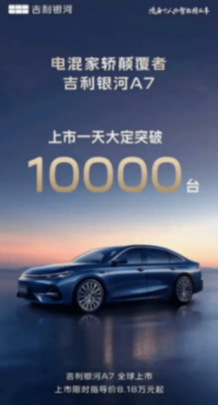 8 月 9 日消息,吉利今日宣布,銀河 A7 上市 1 天大定突破 1 萬臺,限時指導(dǎo)價 8.18 萬元起。