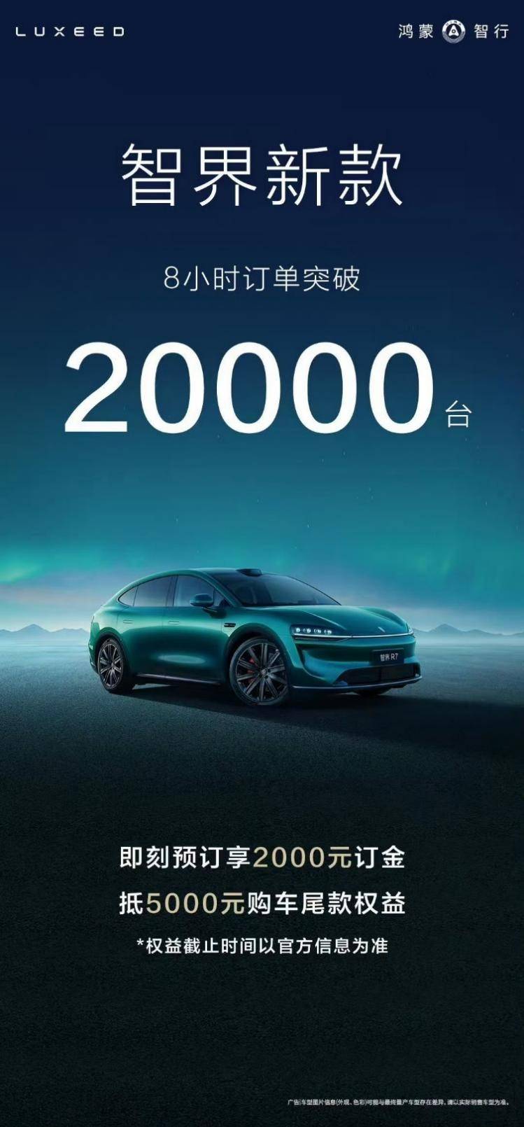 8月8日,智界汽車正式開啟智界R7與智界S7新款車型預售。其中,智界S7預售價25.8萬起,智界R7預售價26.8萬起。不僅如此,智界還貼心推出2000元訂金可抵5000元購車尾款的超值權益,目前展車已下線,即將于本周內進店,瞬間點燃了消費者的購車熱情。據官方消息,開啟預訂后8小時訂單就突破20000臺。