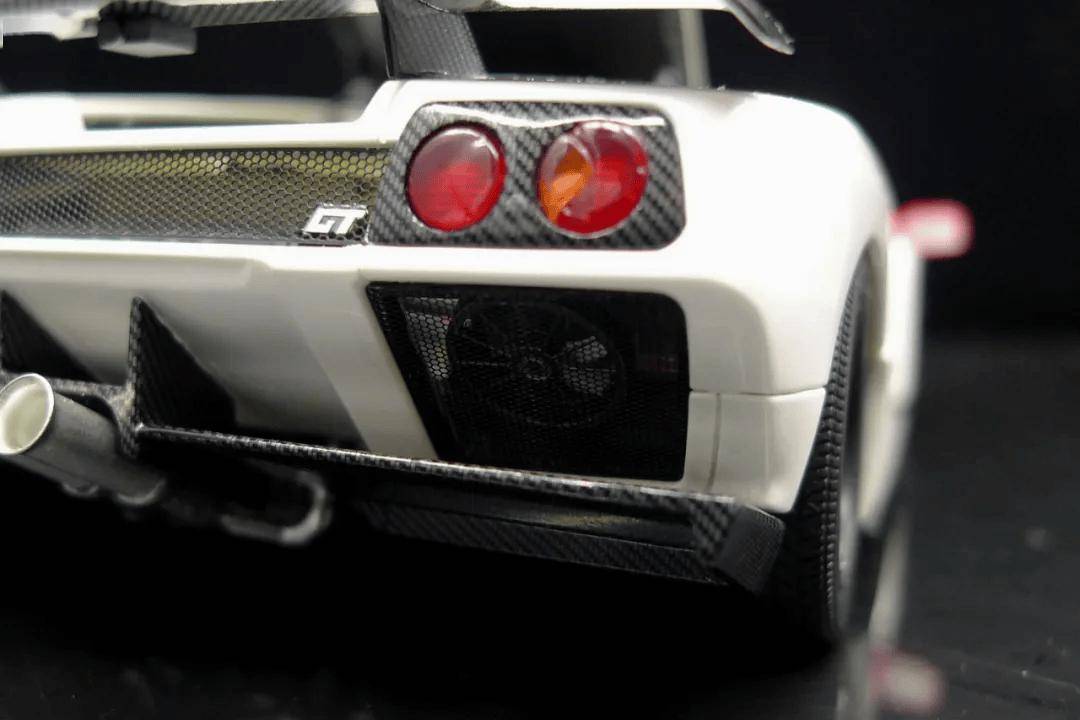 四圓的尾燈也是獨(dú)立件,而且質(zhì)感不錯(cuò);車尾的其他標(biāo)志都是移印的,車尾也有多個(gè)通風(fēng)口,同樣是浮雕+涂黑刻畫;雙出的排氣管應(yīng)該時(shí)獨(dú)立分件的,管口有挖深處理,尾部擴(kuò)散器也是獨(dú)立分件的,排氣管在擴(kuò)散器之下;模型的尾翼也是獨(dú)立件的。