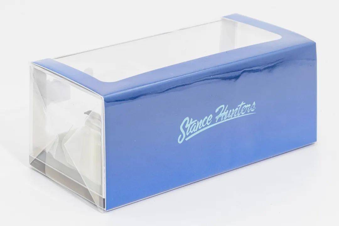 產(chǎn)品的包裝采用標(biāo)準(zhǔn)的紙?zhí)?亞克力盒的方式,藍(lán)色的紙?zhí)缀蜏\藍(lán)色的品牌標(biāo)志和之前SH的產(chǎn)品一樣;包裝內(nèi)部是亞克力罩+黑色塑料底座+金屬銘牌,模型還配送多一套白色輪轂的輪子(含輪軸)。
