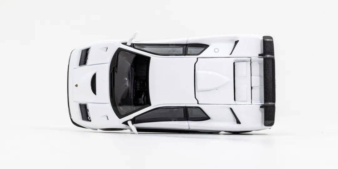 現(xiàn)在的小比例模型由于開發(fā)設(shè)計(jì)的流程都非常相似,在3D建模后都會(huì)對(duì)數(shù)據(jù)進(jìn)行多次完善,因此不太容易出現(xiàn)形準(zhǔn)的問題,起碼這臺(tái)Diablo GT目測(cè)形準(zhǔn)沒大問題,模型的珠光白色漆面質(zhì)感不錯(cuò),縫隙也比較自然,也沒有縫隙邊緣露底的情況;模型側(cè)面的進(jìn)氣口結(jié)構(gòu)都是浮雕+內(nèi)部涂黑刻畫的,前唇和側(cè)包圍用黑色漆分色;車外后視鏡也是白色的,車窗邊框?yàn)楹谏?,黑色B柱是立體的。