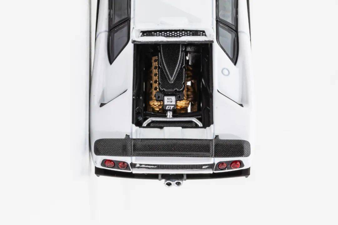 模型的后蓋是可以打開的,后蓋上的通風(fēng)網(wǎng)也是金屬鏤空材質(zhì)的;內(nèi)部的V12發(fā)動(dòng)機(jī)為獨(dú)立結(jié)構(gòu),缸體和管路結(jié)構(gòu)細(xì)節(jié)還原到位,缸蓋還有碳纖維的細(xì)節(jié),更難得是發(fā)動(dòng)機(jī)為完全獨(dú)立結(jié)構(gòu),可以穿透到底盤,發(fā)動(dòng)機(jī)上“6.0L V12 GT”的標(biāo)志清晰可見。