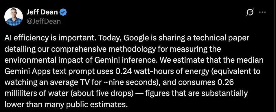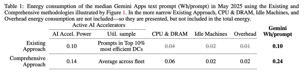一次Gemini查詢僅能耗0.24wh,相當于微波爐運行1秒,排放0.03 g CO?e,甚至比人放一次屁還少,同時消耗約5滴水。