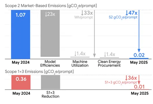 一年間,通過模型優化和額外清潔能源的使用,Gemini的能耗降至原來的1/33,碳排放降至1/44,同時提供了更高質量的響應。