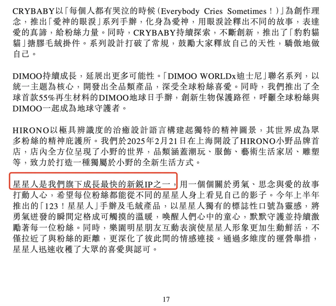 星星人是泡泡瑪特2024年簽約的IP,在手辦、毛絨產品和樂園明星人偶角色的加持下,這一IP迅速走紅。半年報中,官方稱,星星人為“旗下成長最快的新銳IP之一”。
