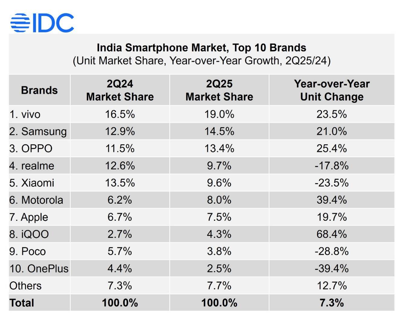 根據IDC數據,2025年第二季度,印度智能手機市場出貨量同比增長高達7.3%,達到3700萬部。其中,vivo和三星表現亮眼,取得超過20%的增速,占據前二寶座;OPPO以13.4%的市占率位列第三,而小米出貨量同比大跌23.5%,市場份額僅9.6%,排名第五。