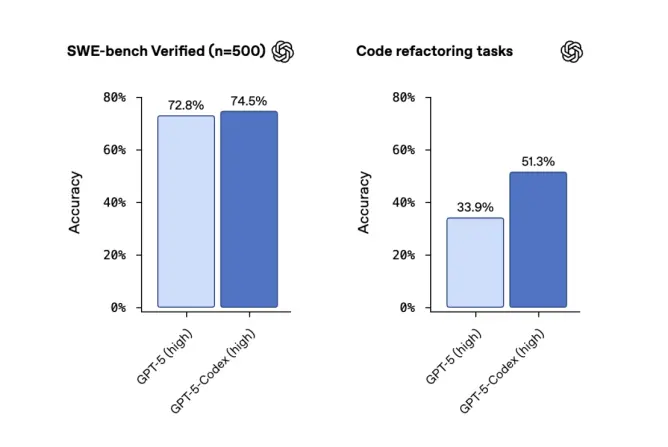 根據 OpenAI 數據,GPT-5-Codex 在 SWE-bench Verified 測試以及大型代碼庫的重構任務中,均優于標準 GPT-5 模型。