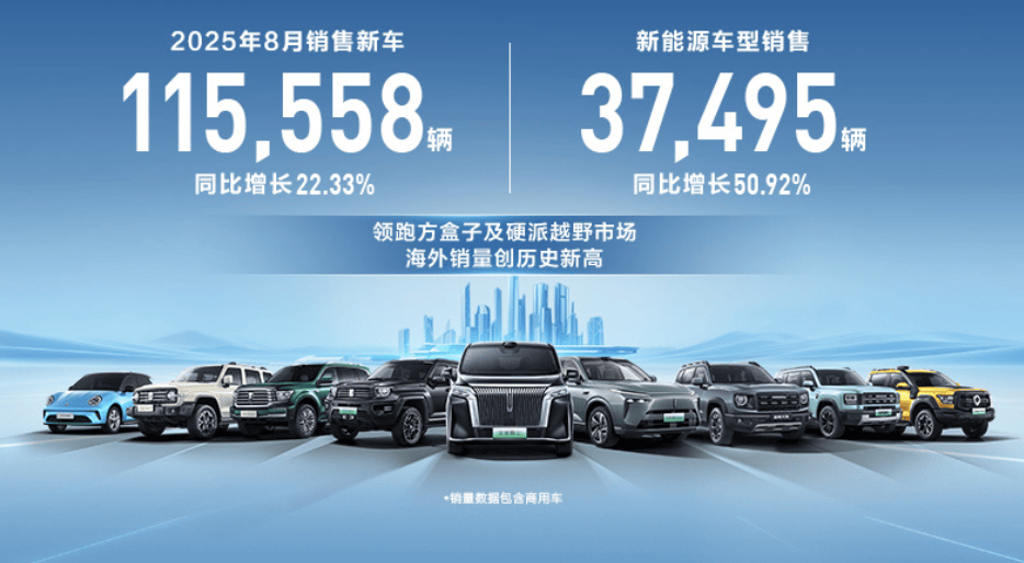 日前,長城汽車發布2025年8月銷量成績單。數據顯示,長城汽車8月銷售新車11.56萬輛,同比增長22.33%,創下歷史最佳8月銷量表現,1~8月,長城汽車共計銷售新車78.97萬輛,同比增長5.94%,反映出其產品競爭力和市場適應性。