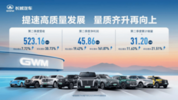 從上半年財務數據來看,長城汽實現營收923.3億元,同比增長1.0%;歸母凈利潤63.4億元,同比下降10.2%。第二季度表現顯著改善,2025Q2實現營收523.2億元,較去年同期增長7.7%,環比增長高達30.7%。