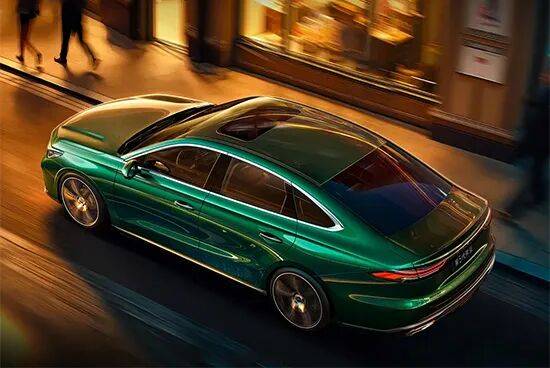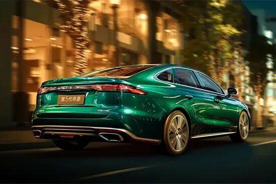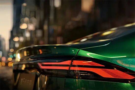 尾燈造型扁平修長,與時下流行的轎跑風格不同,更強調三廂轎車的舒展與優雅。貫穿風格尾燈組內部為全LED光源,超紅光燈帶擁有超300米的穿透能力,在雨霧、沙塵和強光環境下都能有很高的辨識度。此外,后包圍底部的銀色飾條與側裙融為一體,大幅強化了整體感,兩側均配備仿排氣裝飾。