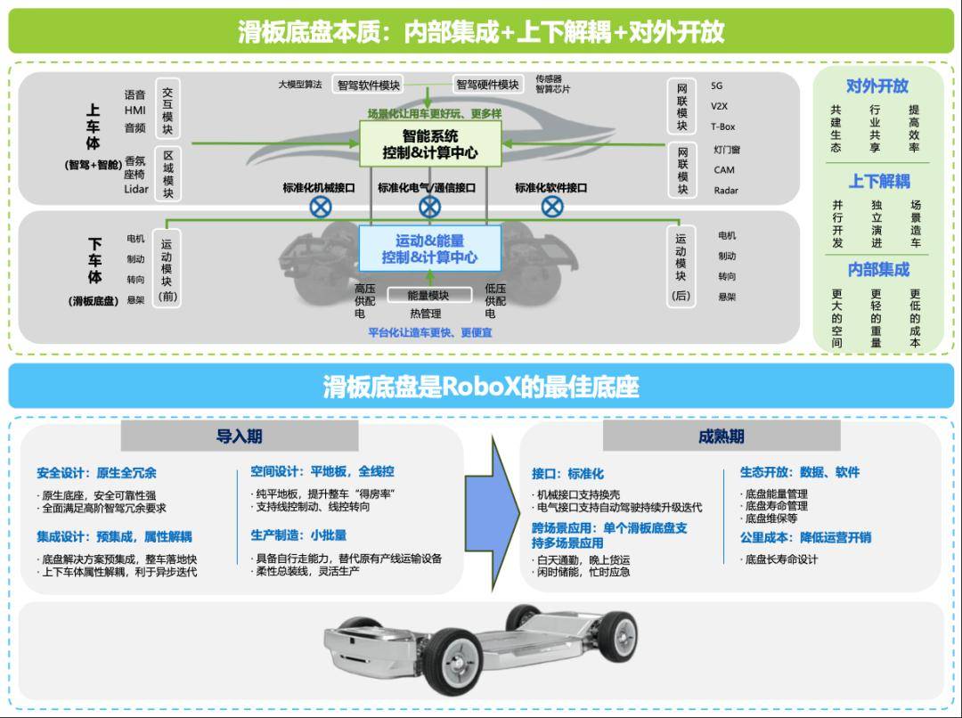 “滑板底盤憑借內(nèi)部集成、上下解耦、對外開放的本質(zhì),在導(dǎo)入期就具備原生安全冗余、平地板全線控、預(yù)集成解耦和小批量靈活生產(chǎn)的特征,進(jìn)入成熟期后更實(shí)現(xiàn)了接口標(biāo)準(zhǔn)化、生態(tài)開放化、跨場景應(yīng)用及公里成本降低等優(yōu)勢。我們認(rèn)為,滑板底盤是RoboX的最佳底座,能讓造車更快更便宜,用車更好玩更多樣。