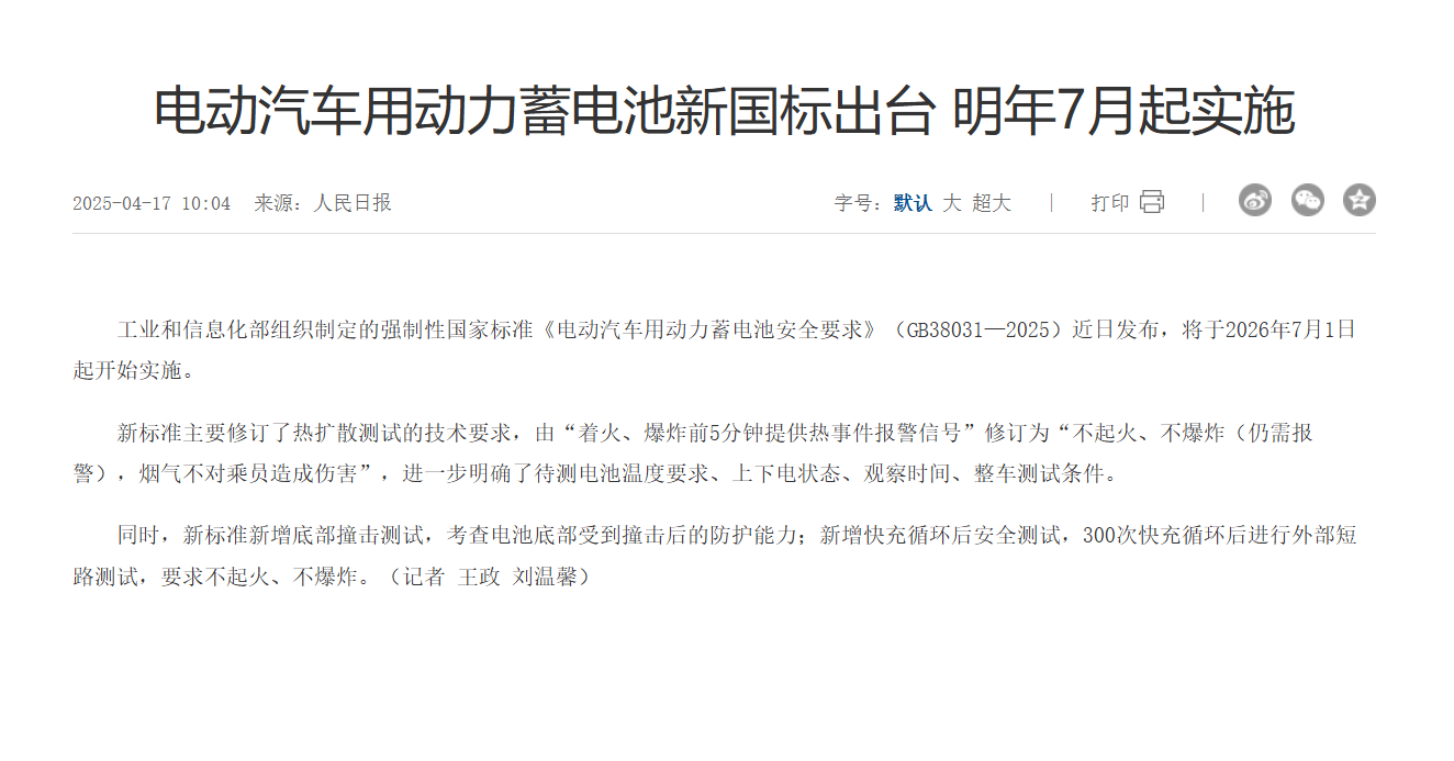 新國標主要修訂了動力電池熱擴散測試的技術要求,由“著火、爆炸前5分鐘提供熱事件報警信號”修訂為“不起火、不爆炸(仍需報警),煙氣不對乘員造成傷害”。