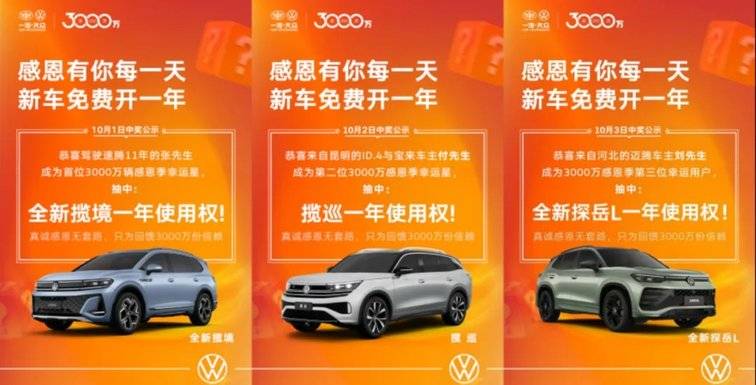 就拿迎接3000萬(wàn)輛這一里程碑式的企業(yè)盛事為例,除了上面談到的“加配不加價(jià)”推出邁騰3000萬(wàn)輛甄選款這樣的良心好產(chǎn)品之外,為了讓更多的新老車主用戶能夠輕松感受到一汽-大眾的暖心與誠(chéng)意,在國(guó)慶假期前他們就別出心裁地推出了“3000萬(wàn)用戶感恩禮”活動(dòng):