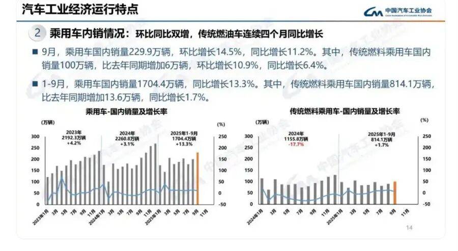 9月傳統燃料乘用車國內銷量100萬輛,比去年同期增加6萬輛,環比增長10.9%,同比增長6.4%。而這已經是年內的第四次同比增長,更難得的是,1-9月傳統燃料乘用車國內銷量814.1萬輛,比去年同期增加13.6萬輛,同比增長1.7%。