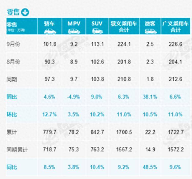 乘聯會數據顯示,9月全國乘用車市場零售224.1萬輛,同比增長6.3%,環比增長11.0%,“金九”效果凸顯。今年以來累計零售1700.5萬輛,同比增長9.2%。