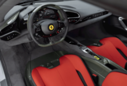 腳部空間、中控臺、儀表盤嵌件、換擋撥片、方向盤及座艙后部均采用碳-凱夫拉復合材料,這在現代法拉利車型中尚屬首次。帶有SC40標識的桶形座椅采用紅色提花科技面料包裹,座艙其余部分則搭配深灰色Alcantara材質。
