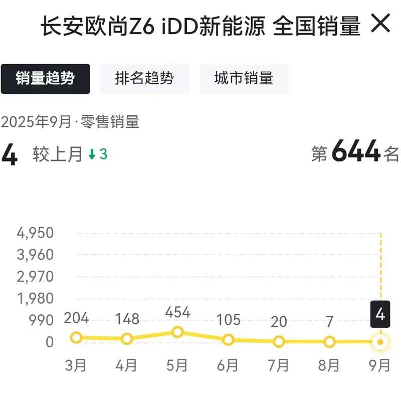 而長安歐尚Z6 iDD在9月份的銷量為4輛,相比今年8月份的銷量7輛,環(huán)比下滑42.85%,相比去年9月份的銷量830輛,同比下滑99.51%。同時(shí),長安歐尚Z6 iDD自今年5月份開始,也已經(jīng)連續(xù)4個(gè)月出現(xiàn)環(huán)比下滑。