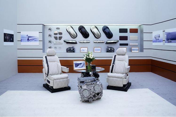 嵐圖的設(shè)計(jì)師們大膽地將直播現(xiàn)場變成了一個(gè)“爆炸件空間”,把座艙的每一個(gè)組成部分——從一塊皮革到一片木飾——都懸置空中,仿佛將一首立體的山水詩篇拆解成一個(gè)個(gè)靈動(dòng)的字符,讓你能親手觸摸到設(shè)計(jì)的溫度與匠心。座艙的整體氛圍以“山勢(shì)”為骨架,給人以穩(wěn)定、包容的安全感;以“川流”為血脈,讓整個(gè)空間充滿了流動(dòng)的韻律。