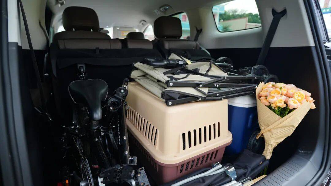 我們嘗試了一下,這樣的空間可輕松同時容納大號寵物箱、全套露營裝備,包括野餐籃、咖啡壺等物品,讓人對用車場景充滿無限遐想。