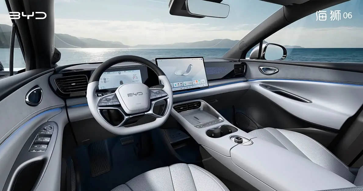 海獅06的內(nèi)飾延續(xù)了比亞迪海洋系列的簡潔風(fēng)格,采用柔和流暢的線條設(shè)計(jì)。中控臺層次分明,配備懸浮式液晶儀表盤和大尺寸中控屏,搭配四幅式飛魚仿生方向盤及懷擋設(shè)計(jì),營造出科技感十足的座艙氛圍。中央扶手區(qū)保留了無線充電、啟動按鍵等常用物理按鍵,提升操作便利性。