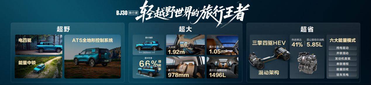 此外,北京越野還將硬核技術與場景適配作為核心策略,賦予BJ30旅行家輕越野世界的旅行王者實力,使其在細分市場形成差異化優(yōu)勢。