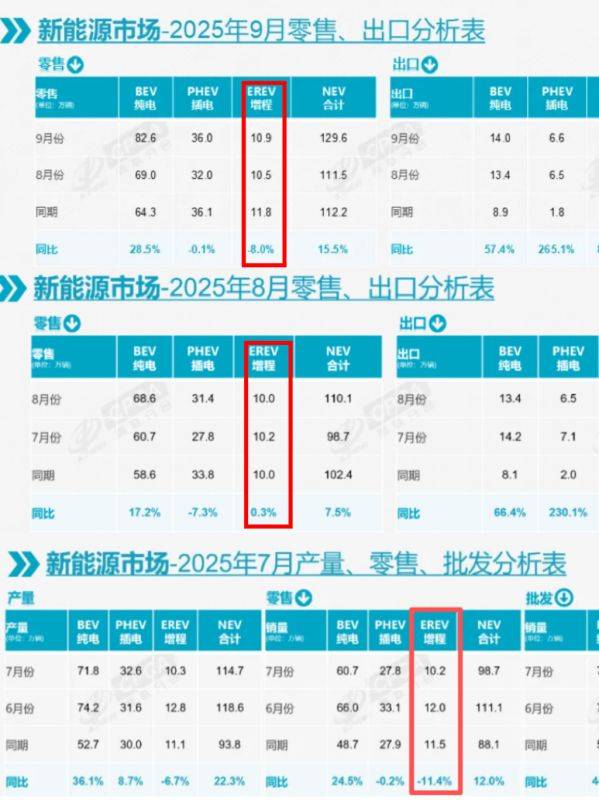 然而進入2025年,增程汽車的高速增長勢頭卻戛然而止,甚至陷入同比下滑的困境,與2024年78.7%的全年高增幅形成鮮明反差。以剛剛過去的三季度為例,乘聯分會數據顯示,7-9月國內增程汽車零售量分別為10.3萬輛、10萬輛、10.9萬輛,同比表現僅8月實現0.3%的微增,7月和9月則分別同比下滑11.4%、8%,結束了此前連續兩年的爆發式增長態勢。