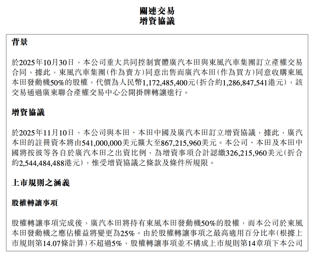 廣汽集團(tuán)在公告中也明確表示,此次交易旨在“推動(dòng)廣汽本田實(shí)現(xiàn)發(fā)動(dòng)機(jī)領(lǐng)域一體化運(yùn)營(yíng)”,從而“提升供應(yīng)鏈穩(wěn)定性與自主性,降低關(guān)聯(lián)交易成本,同時(shí)提高對(duì)核心零部件生產(chǎn)的管理效率”,這清晰地表明了此次資本運(yùn)作的戰(zhàn)略意圖。