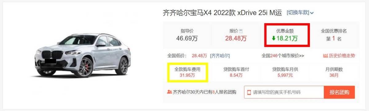 就拿齊齊哈爾地區經銷商的報價為例,原價46.69萬元的2022款寶馬X4 xDrive 25i M運動套裝,目前經銷商已經能給到18.21萬元的大幅優惠,而優惠完之后新車最低價已經來到了28.48萬元,相當于新車就打6折出售,這你受得了嗎?也可見部分經銷商清庫存的力度和決心有多大。