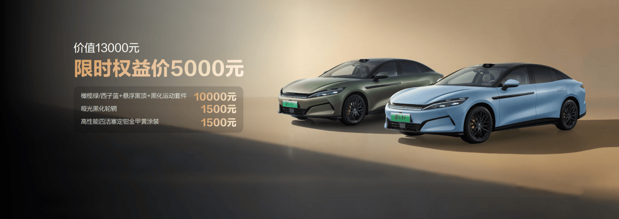 在產品之外,比亞迪特別推出豐厚外觀限時選裝權益。漢L原價13000元的外觀套裝(含橄欖綠/西子藍車色、懸浮黑頂、黑化運動套件、啞光黑化輪輞、性能四活塞定鉗金甲黃涂裝),限時權益價僅需5000元!購車還可享高達15000元的超級置換禮。