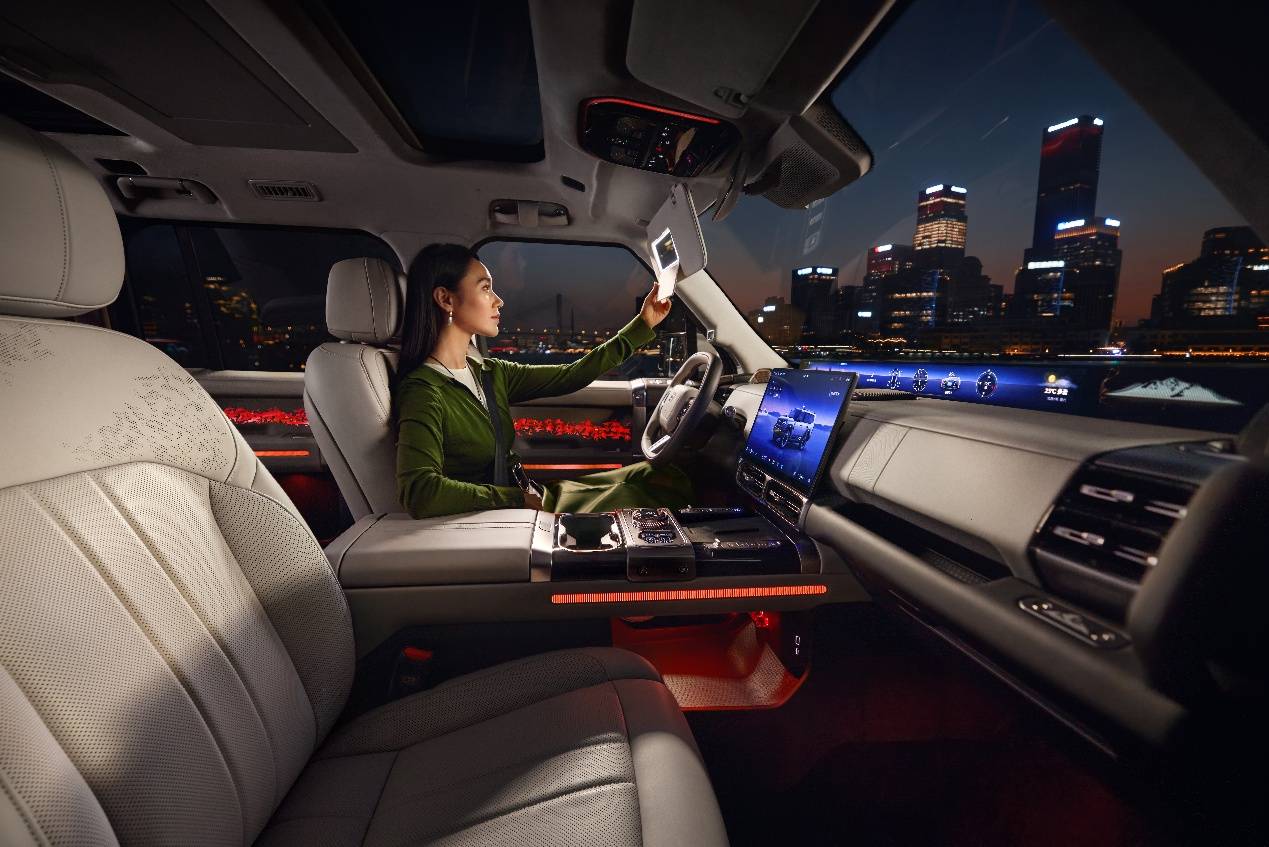尾部配備縱向熏黑尾燈、雙側(cè)拖車鉤和隱藏式排氣,定制交互尾燈支持多種圖案設(shè)置。后掛備胎搭配電動(dòng)吸合側(cè)開(kāi)尾門,兼顧越野屬性與便利性。