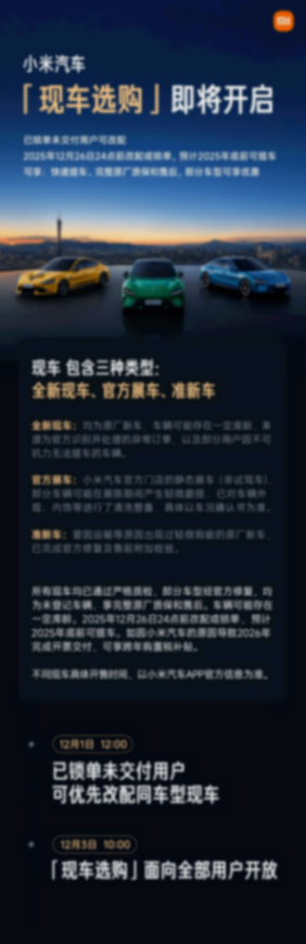 但值得吐槽的是,近期小米的在12月1日開啟了“現車選購”通道,用展車、瑕疵車、別人下定后不要的準新車,然后小米給你簡單翻新之后,再以原價賣給你。不得不說還是小米會做生意啊,那我為什么不去買零公里二手車呢?大家是人傻錢多嗎?看來小米為了沖業績也是拼了。