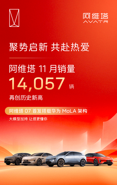 阿維塔11月銷量14057輛再創新高,已連續 9 個月銷量破萬,旗下阿維塔06和07作為品牌主力,搭配華為的智駕和座艙,非常能打。