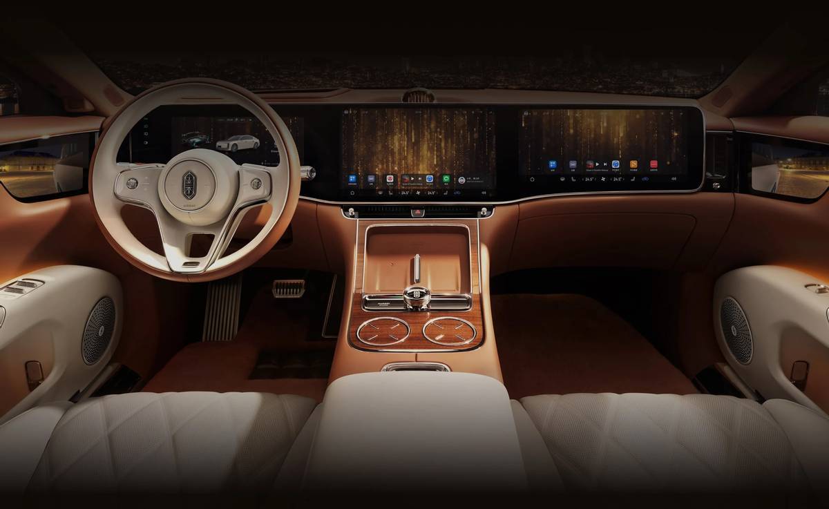 內飾部分,該車中控臺采用平直線條,配備真皮雙色方向盤、HUAWEI XHUD、一體環宇三聯屏、智能電子內外后視鏡等。副駕可操作中控大屏與副駕娛樂屏,通過三指滑動實現多屏無縫流轉;中控下方配有雙50W無線超級快充面板、雙60W有線超級快充插口,無線快充面板支持雙折疊屏手機展開充電。