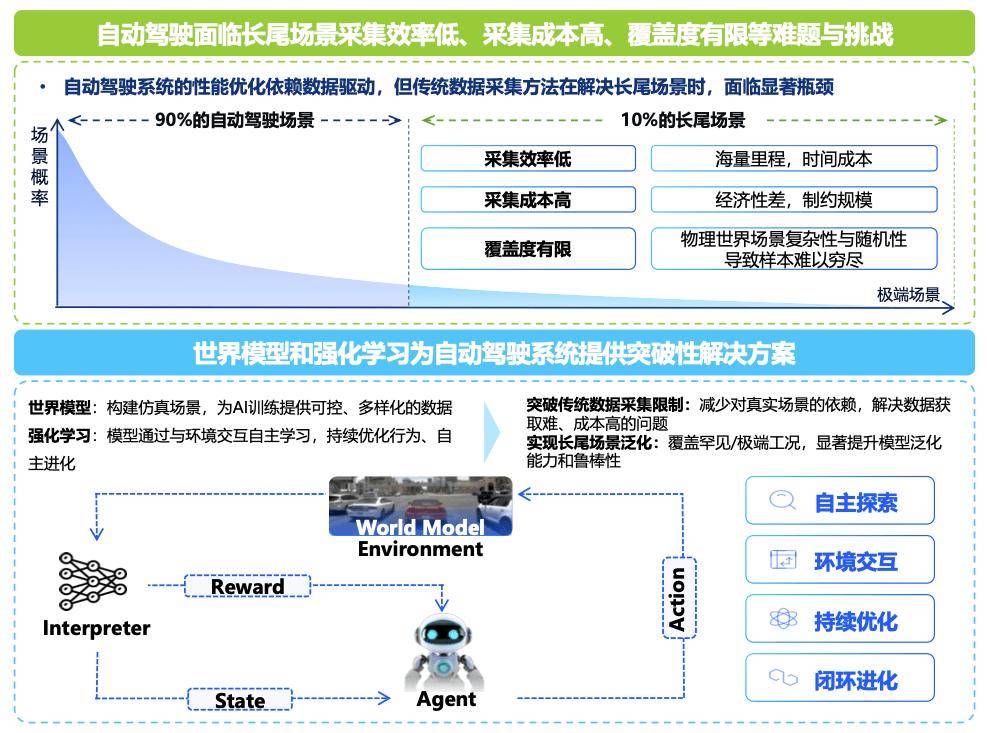 中國汽車工程學會高級會員、地平線首席生態官徐健在三十二屆中國汽車工程學會年會暨展覽會人工智能主論壇中提出:“當前,自動駕駛面臨長尾場景采集效率低、采集成本高、覆蓋度有限等難題與挑戰,世界模型與強化學習可為其提供突破性解決方案——通過打造高度逼真的數字孿生世界,構建虛擬交通環境,使AI模型能夠通過與環境的海量交互,基于獎勵機制持續優化駕駛策略,這種閉環自進化機制不僅突破了傳統數據采集的瓶頸,更能系統性攻克長尾場景泛化難題,最終實現自動駕駛性能的階躍式提升。”