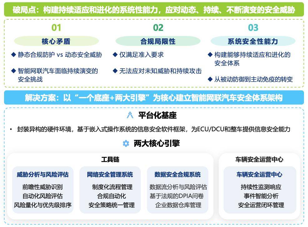 云馳未來副總經理劉欣芳在三十二屆中國汽車工程學會年會暨展覽會“智能網聯汽車融合安全技術”專題論壇中表示:“當前,智能網聯汽車的信息安全面臨的核心矛盾是靜態合規防護與動態安全威脅之間的不匹配。傳統的安全建設思路基于現有法規的合規要求進行建設,存在三大局限性:被動滯后、無法應對未知且體系割裂。云馳未來提出以‘一個底座+兩大引擎’為核心,建立智能網聯汽車安全體系架構,可實現從被動防御到主動免疫,通過這三者的整合,打破車輛異構的困境,實現了從預測到處置的閉環自治。”