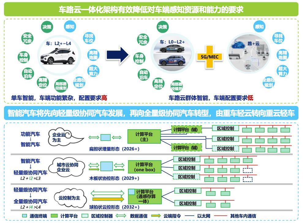 中國一汽研發總院車路云星課題組吳杭哲認為:“‘車路云一體化’群體智能系統架構,一方面解決了單車智能全域感知能力不足,另一方面可以借助路側布設的感知系統和云控平臺實現綜合決策能力提升,作為高等級智能駕駛安全的冗余補充,有效降低對車端感知資源和能力的要求。一汽的架構下,智能汽車將先向輕量級協同汽車發展,其特點是重車輕云,云端信息提供感知增強和決策輔助,再向重云輕車的全量級協同汽車轉型,實現協同感知、協同決規和協同控制。”