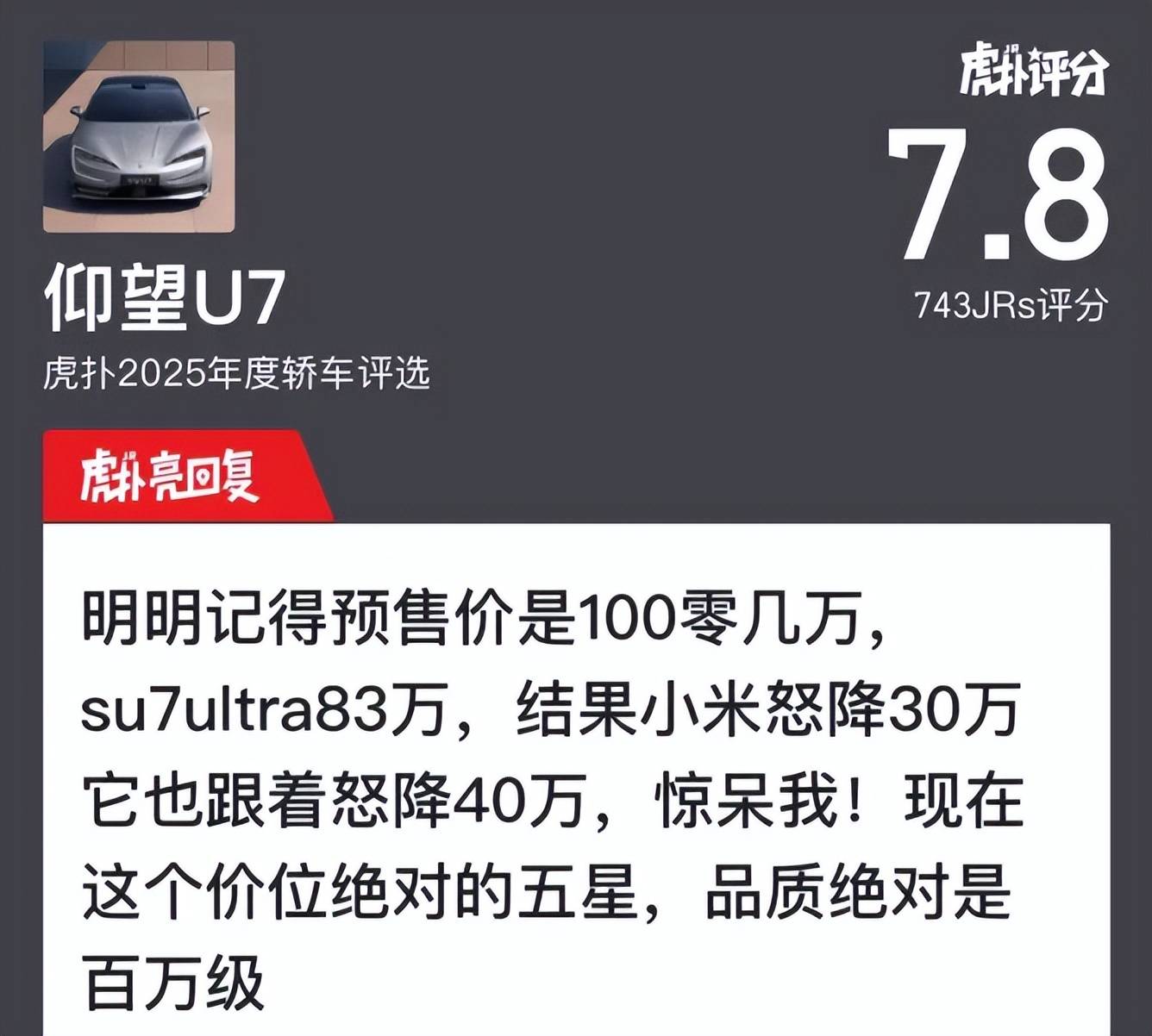 這是一臺定價百萬級的純電旗艦轎車,它的對手是保時捷Panamera、奔馳S級這種級別的怪物。超過1300匹的馬力、顛覆性的“易四方”四電機獨立驅(qū)動技術(shù)、可以跳舞的云輦智能車身控制系統(tǒng)……U7身上的每一個標(biāo)簽,都在告訴你兩個字:牛X。仰望U7把黑科技都用在實地方了,不是炫技而是真安全,就是價格讓普通消費者望塵莫及。某撲直男們評價也比較正面:雖不能至,心向往之。
