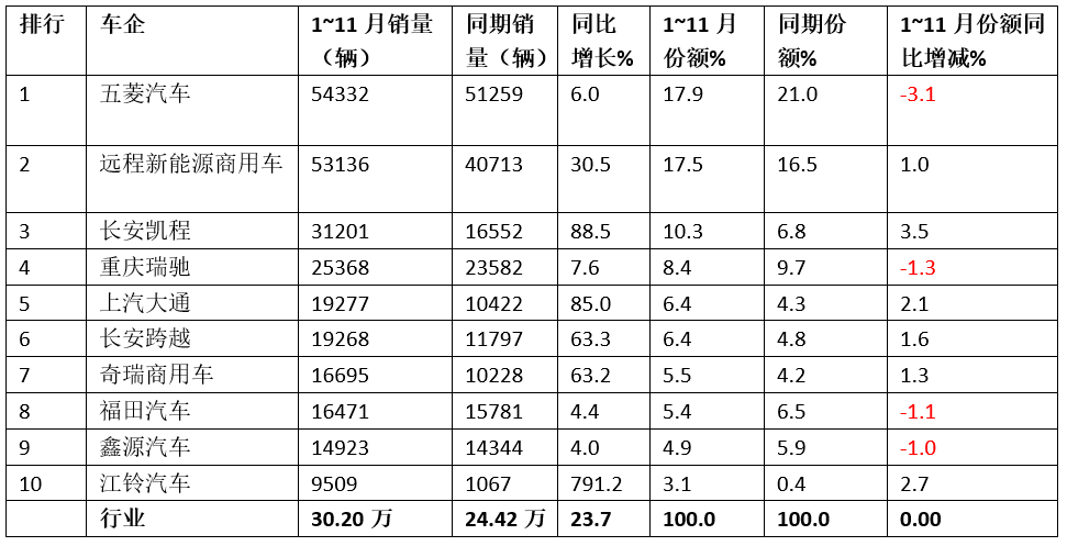 表3,2025年11月新能源VAN前10車企銷量同比及市場占比統計(數據來源:終端上牌)