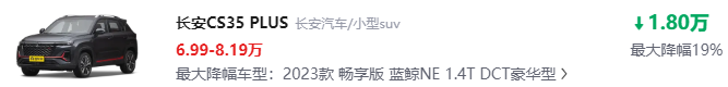 第一臺(tái)車長安CS35 PLUS,最大降幅比例19%,售價(jià)下調(diào)1.8萬,裸車起步6.99萬,頂配8.19萬,配置拉滿都不到9萬。這臺(tái)小型SUV顏值是非常耐看,內(nèi)部的空間也挺大的,車身長度4.33米,但它寬度有1.82米,軸距是2.6米,完全能夠保證你的乘坐體驗(yàn)。